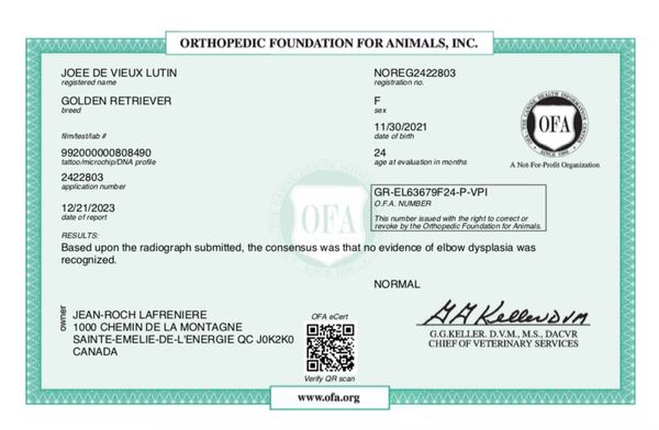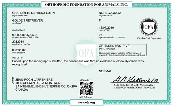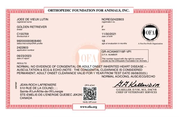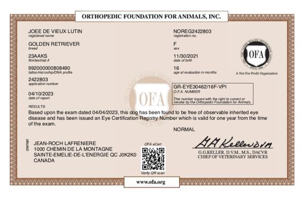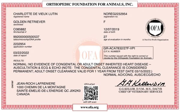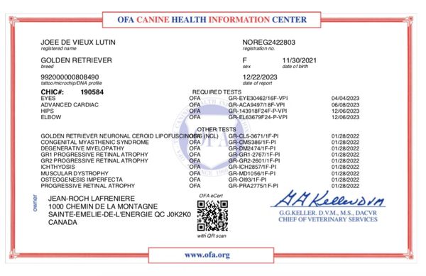 Son analyse de l'ADN montre ses qualités 100% Golden Retriever et l'absence de toutes maladies génétiques transmissibles. Sa certification de santé CHIC de l'OFA (Ortohopedic Foundation for Animals) est disponible dans le domaine public sur le site de l'OFA .