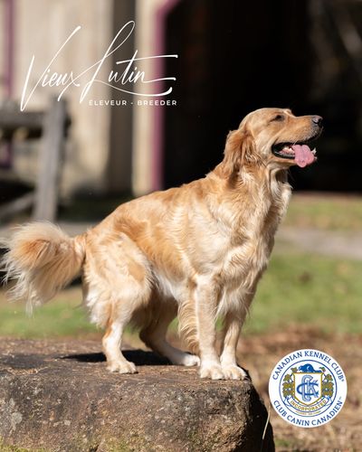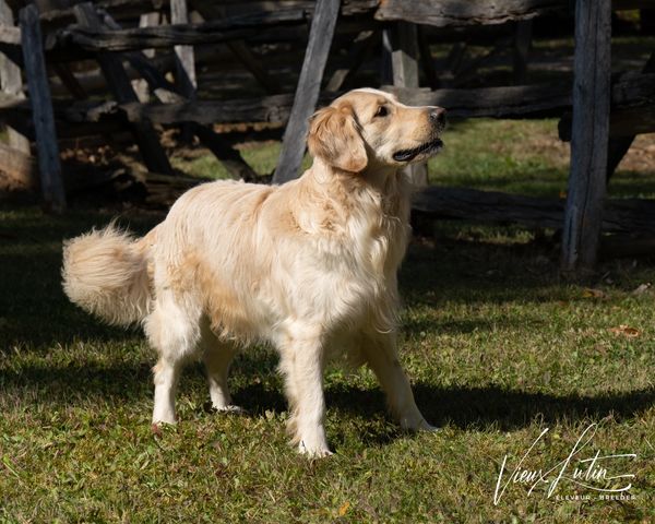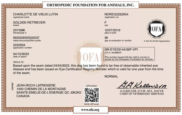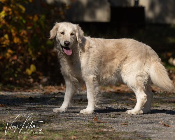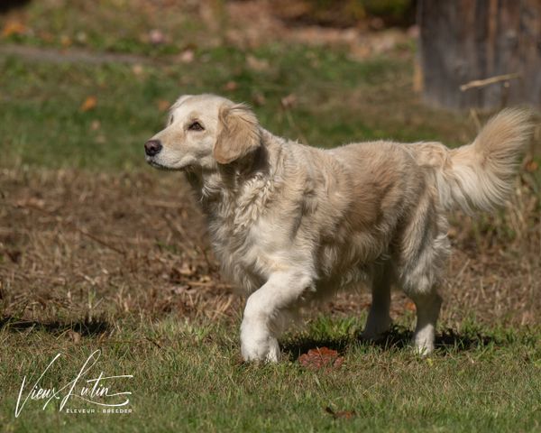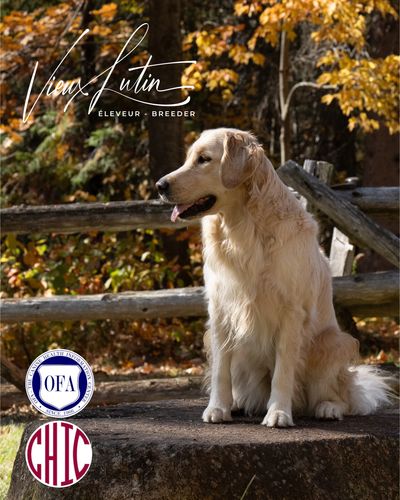 Née le 30 novembre 2021, mature et aussi qualifiée aux mêmes standards de santé CHIC de l'OFA, elle nous fait l'honneur de ses premiers chiots en mai 2024 . Aux standards du Golden Retriever pour une femelle, 62 lbs et 22 pouces, sa fourrure riche et soyeuse est d'un blanc crème anglaise (ECGR) avec de légères nuances de blonds. Son analyse de l'ADN montre ses qualités 100% Golden Retriever et l'absence de toutes maladies génétiques transmissibles. Sa certification de santé CHIC de l'OFA (Ortohopedic Foundation for Animals) est disponible dans le domaine public sur le site de l'OFA .