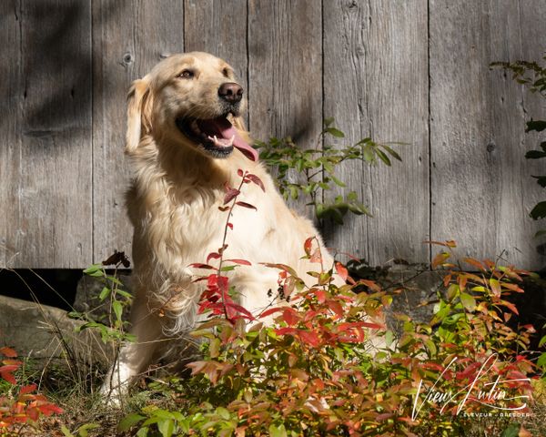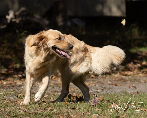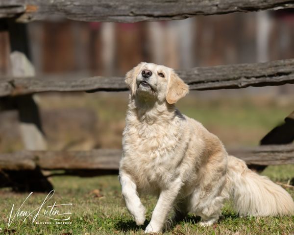 À l'origine de notre programme d'élevage canin, Charlotte inspire tous nos choix et nos orientations. Née le 7 décembre 2019, mature et aux standards du Golden Retriever pour une femelle, 60 lbs et 21,5 pouces, sa fourrure d'un blanc crème anglaise (ECGR) est particulièrement riche et soyeuse. Sa queue bien droite et fournie attire l'attention et communique souvent ses intentions.