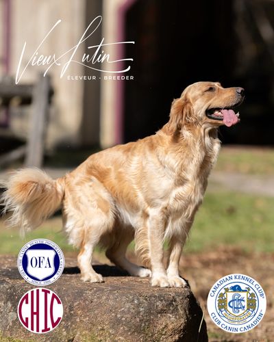 Née le 30 novembre 2021, mature et aussi qualifiée aux mêmes standards de santé CHIC de l'OFA, elle nous fait l'honneur de ses premiers chiots en mai 2024 . Aux standards du Golden Retriever pour une femelle, 62 lbs et 22 pouces, sa fourrure riche et soyeuse est d'un blanc crème anglaise (ECGR) avec de légères nuances de blonds. Son analyse de l'ADN montre ses qualités de race 100% Golden Retriever et l'absence de toutes maladies génétiques transmissibles.